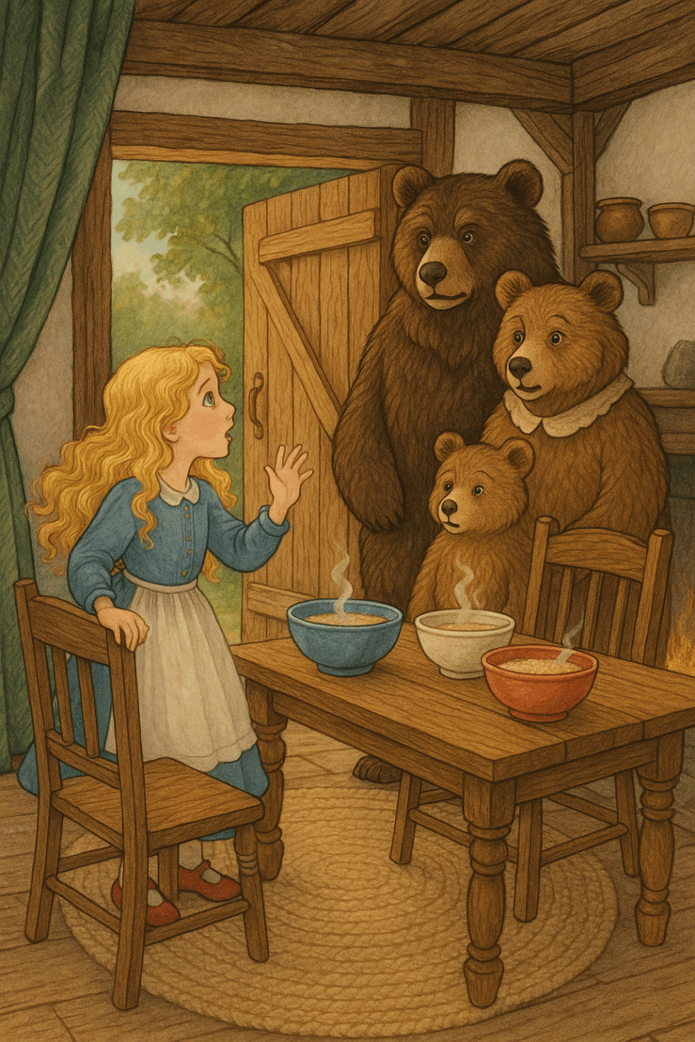 Det var en gang tre bjørner som bodde i et hus langt inne i skogen. Den ene var en stor svær pappabjørn, den andre var en mellomstor mammabjørn og den tredje var en bitteliten babybjørn.En morgen laget mammabjørnen en diger gryte med grøt til frokost. Hun fylte en stor bolle til pappabjørnen, en mellomstor bolle til seg selv og en bitteliten bolle til babybjørnen.Så gikk de en tur i skogen mens de ventet på at grøten skulle bli kald.